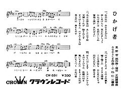 昭和39年(1964)、星野氏とクラウンの関係者一行が宮古まで来て、この田中の作った「ひかげ者」を発売する契約を交わした。歌詞は星野哲郎が直し、作曲はたなかとしをの平仮名だった。そしてレコードは昭和41年に発売された。シングルカットで当時の値段で330円。B面は「土曜はきらい」だった。