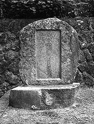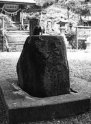 最初に紹介する石碑は社殿右側にあるもので中央に本殿銅板葺替記念とあり、右に昭和九年、左に旧六月十四日とある。台座左には石碑建立に関係した山根正三をはじめ当時の山口村村長、藤田喜一郎ら7名の連名がある。現在の社殿は嘉永3年(1851)に現在の場所に遷宮したものでそれ以前は一段下の境内にあったとされ、現在は旧社殿跡として基礎石が残されている。この碑が建立された昭和9年は山田線・盛岡ー宮古間が開通した年で、同時に黒森神社顕彰会による黒森神社長慶天皇御陵説で宮古が沸き立っていた頃だ。そんな折りに行われたこの工事は江戸末期からの屋根材が朽ち、長慶天皇御陵説を打ち出す神社として見た目にも悪かったために屋根の銅板葺き替え工事が行われたものと考えられる。 (※黒森神社顕彰会は本誌2003年9月号で詳しく紹介)