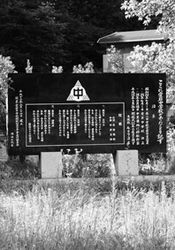 次の石碑も学校に関係する石碑だ。この石碑は中里団地の旧愛宕中学校敷地内北西側にあり、この地が元愛宕中学校であったという証しを後世に伝えるものだ。碑は横長で右に「ここに愛宕中学校があったことを記す」とあり、学校沿革、校歌が刻まれ、左に平成十三年三月二十四日建立、設置・愛宕中学校閉校記念事業実行委員会、瀬浪石材店とある。愛宕中学校の学校沿革は次の通り。昭和22年(1947)宮古第二中学校愛宕分室として設置、25年(1950)独立、36年(1961)中里団地に移転新築。その後卒業生4073名を輩出したが児童数減少に伴い平成13年3月24日学校創立51年の歴史に幕をおろした。現在学校跡地は平地となり校門のみが残る。