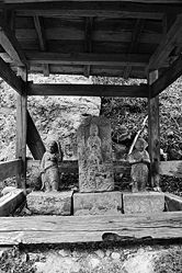 最後は石碑ではなく不動明王に関係する脇侍としての童子だ。不動明王の童子は矜迦羅童子と制叱迦童子の二大童子か、あるいはそれらを含めた八童子やより多くの加護を表す三十六童子の場合もある。童子は仏法を守護するために使役される鬼神で常に童形をしており不動明王とともに仏教に敵対する思想と闘うというものだ。長根の真言の寺である長根の長根寺は三陸三十六不動の二十番札所なので20番目の童子である因陀羅童子のモニュメントがある。