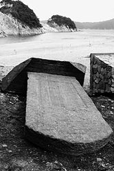 震災から数ヶ月が経ちすっかり形状が変わってしまった通称・奥浄土ヶ浜の石浜を元通りにする工事がはじまった。その際に「沼」と呼ばれる入江の海底に石碑が沈んでいるのが発見されローダーで引き揚げられた。それが写真の寝かされた石碑だ。碑には大海嘯記念碑と横書きされ一、大地震の後には津波が来る…などの注意箇条書があり、石巻市・石井敬二郎の名がある。裏面には津波の義援金で碑が建てられた詳細が刻まれ、宮古町建立の署名がある。ちなみにその昔現在のレストハウスの位置にあった浄土ヶ浜朝日会館という休憩所も津波義援金で建設された建物だった。