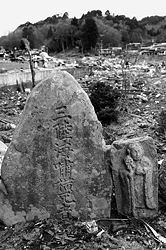 次の石碑は巨大な防波堤が決壊し大きな被害となった金浜地区の神峰山・江山寺山門下の石碑群の中にあった津波供養碑だ。碑は中央に三陸海嘯横死者精霊、右に明治二十九年(1896)六月十五日、左に旧五月五日夕、施主金浜若者中とある。石碑の背景は瓦礫と化した金浜地区、石碑横の野仏と塩水で枯れた植物がより一層被災後もの悲しい雰囲気を醸し出している。おそらく明治の津波でも金浜地区では多くの犠牲者が出たため地区の若者たちが石碑を建立して供養したのであろう。そして今回の震災でもやはり金浜地区では多く犠牲者を出している。