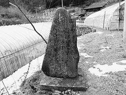 最初に紹介するのは新里地区三ツ石から川井尻石地区につながる林道沿いにある石碑だ。この林道は広域基幹林道三ツ石線で、途中に東北電力腹帯水力発電所の貯水ダムがある。石碑は貯水ダムを通過し数キロ進んだ道路沿いにある。碑には当地合葬諸精霊供養塔、昭和六十一年(1986)九月吉祥日、功徳主・熊谷建設株式会社とあり、背面に広域基幹林道三ツ石線第一工区間建設工事、総延長一一二○三米、完成平成十二年(2000)八月、請負者・熊谷建設株式会社、社長・熊谷勝文、建立・平成十二年八月吉日とある。建設工事会社が供養塔を建てたのはこの林道が昭和40年代末期頃に閉村となった開拓村の民家跡を通っており、おそらく多くの土葬人骨や墓碑などがあったためこれらを一箇所に集め合葬し供養したものだろう。この地にはかなり古い時代から炭焼きなどを営む山から山へと移動する漂泊の民が住んでおり、通称名で千ノ平(せんのだいら)と呼ばれていた。林道工事は1986年から着工しなんと14年もかかり尻石地区までつながった。この林道の頂上となる禰々子森(ねねこもり1010)の尾根沿い蓬平付近には絶景の展望地があり快晴時には北上高地の山々と岩手山までを一望できるという。新里や川井地区の山間部には山を生業とする山の民が作った開拓集落が多く、今でも深山の僅かな平地にも耕作地跡や人家跡が残っている。これらの土地に住んでいた人たちも木材や炭の需要が落ち込み昭和40年代から50年代にかけて里に降りて定住したり別の土地へと移っていったという。