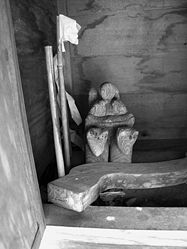次の写真は石碑ではなく変わった神像だ。この神像が納められた祠も宿浜にあり、やはり一般民家の氏神として祀られたもので、被災後に母屋が解体撤去され道路から目視できるようになったものだ。社は稲荷社特有の朱色に塗られたものではないが、神像を見ると二匹の狐の上に何かが乗っているような意匠にも見てとれる。これが狐に乗った女神であればダキニ(荼枳尼)天という稲荷神であるが、像は素人によって手彫りされたと思われるもので断定はできない。また、ダキニ天であっても女神が乗る狐は一匹であり意匠的にも不思議だ。